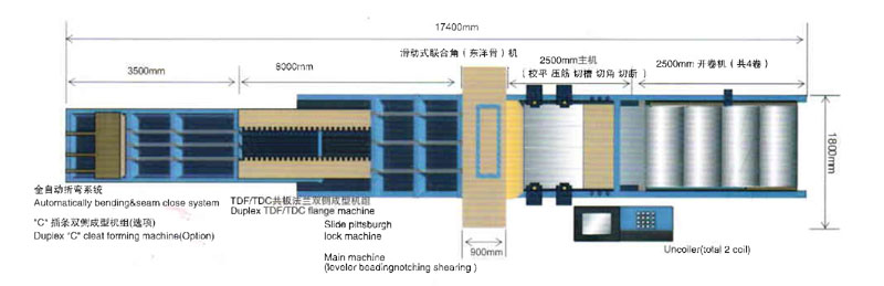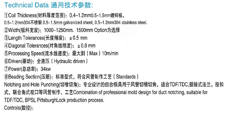 全自动生产V线,可冲中心支撑孔、法兰边腰孔;升降式位移咬口机可直接成型联合角压制,可直接完成平板型、L型、U型、W型,是目前国内功能齐全、性能优良、自动化程度高的一种全新风管自动生产线